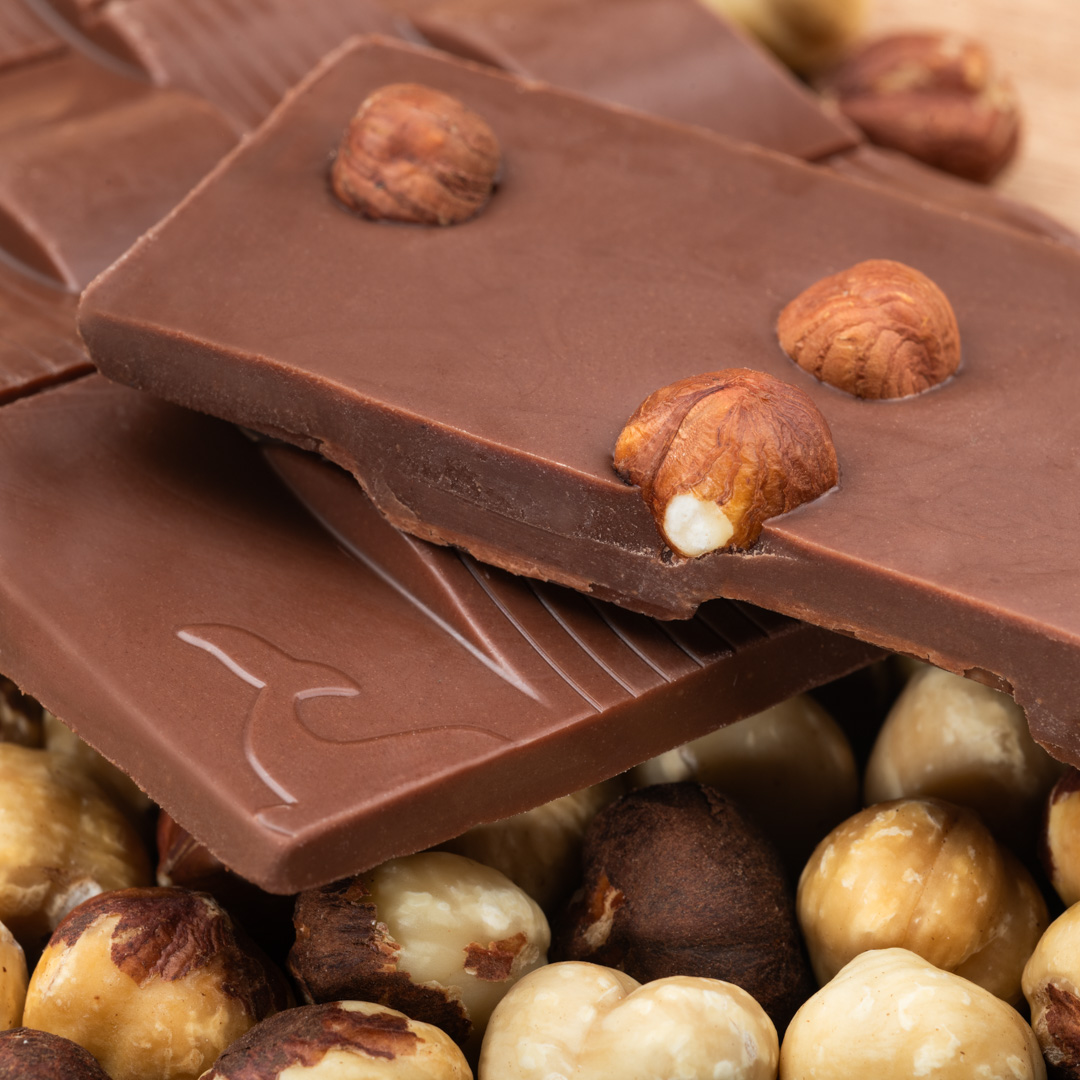 Chocolat au lait 50% de cacao : sucre bio français, cacao, beurre de cacao, pourdre de lait 26%MG et noisettes torréfiées (10%)