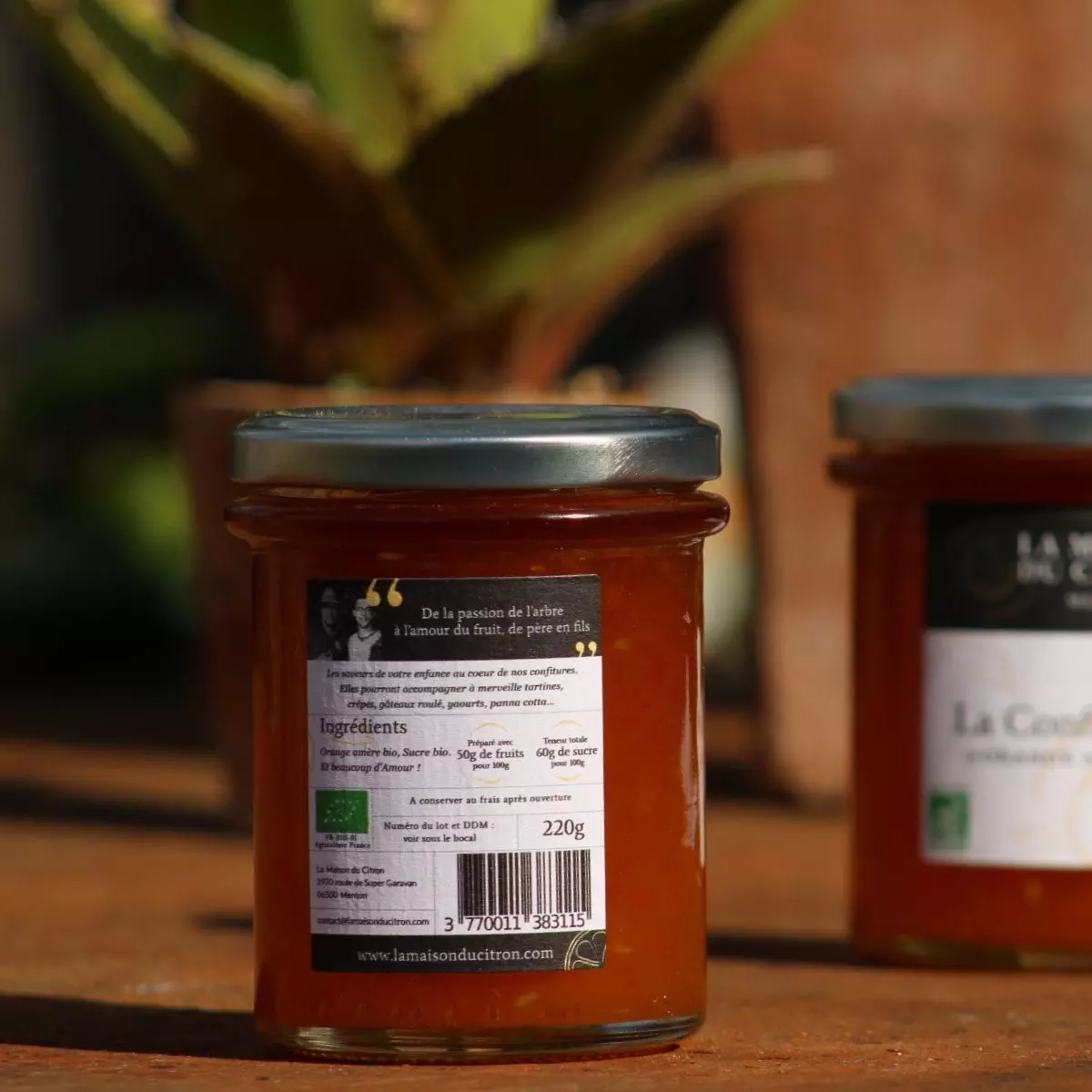 Ingrédients Orange amère Bio, sucre Bio. Et beaucoup d'amour ! Préparée avec 50 g de fruits pour 100 g. Teneur totale de 60 g de sucre pour 100 g.