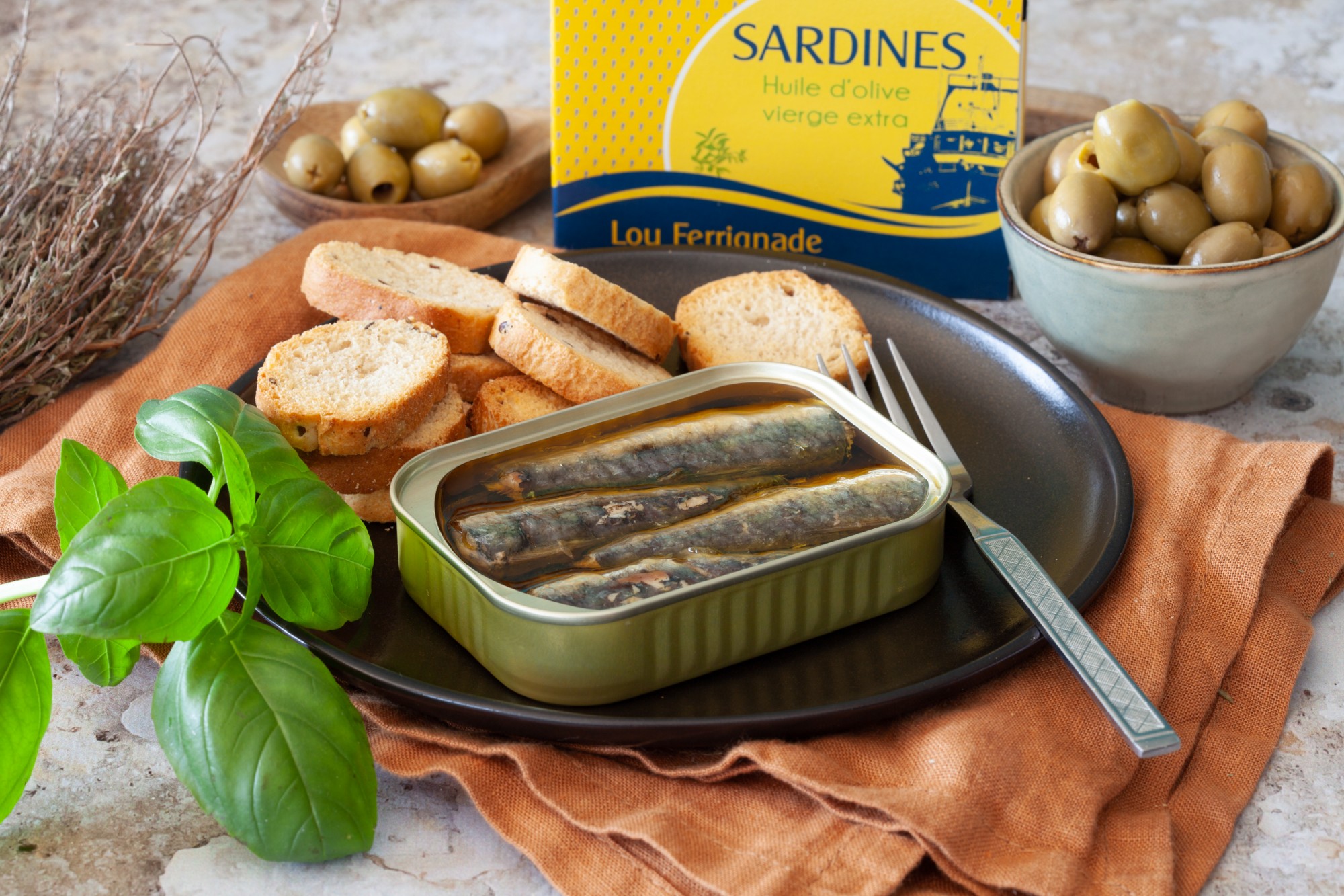 Nous vous proposons notre première sardine "sardines à l'huile d'olive" de la gamme "Lou Ferrigande" préparées entièrement à la main comme autrefois, nos sardines sont mises sur des grilles et cuites au four pour les rendre plus légères et plus digestes. Elles sont garanties sans friture.